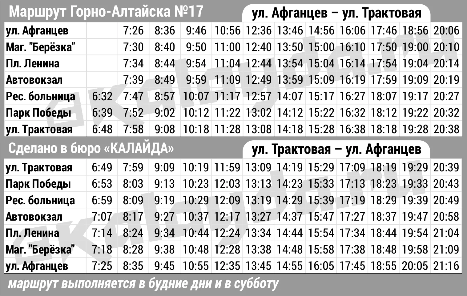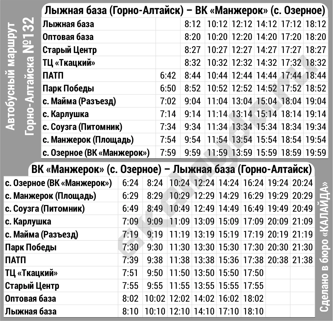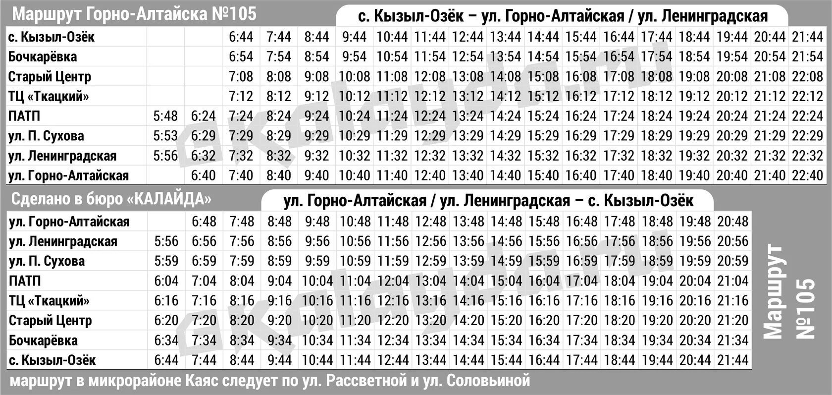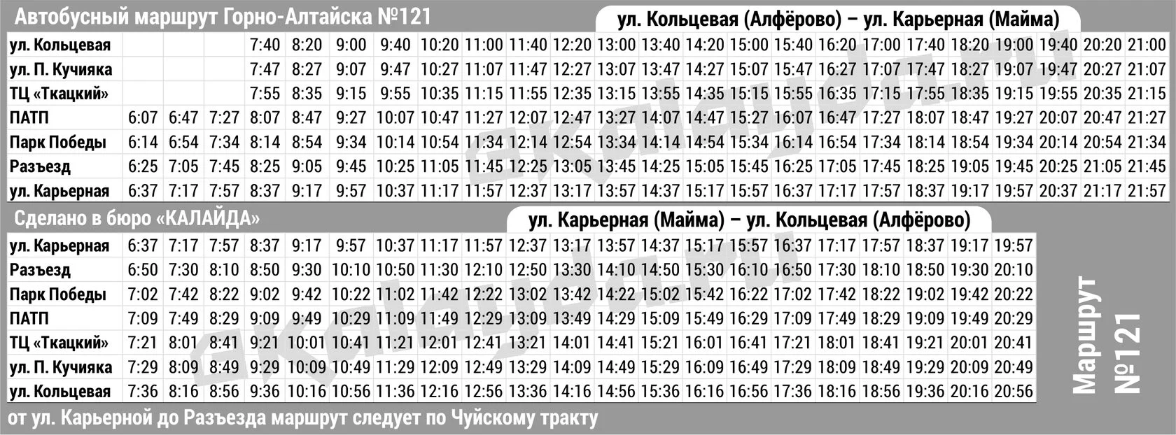 * Расписание автобусных рейсов Горно-Алтайска является актуальным на 11.11.2025 г., однако имеет свойство внезапно меняться. Информацию по междугородним рейсам уточняйте в справочной Горно-Алтайского автовокзала по телефону 8(38822)2 24 57, по городским — в диспетчерской службе перевозчика 8(38822)4 19 04, а по пригородным — в Горно-Алтайском союзе индивидуальных автопредпринимателей 8(38822)4 91 86.