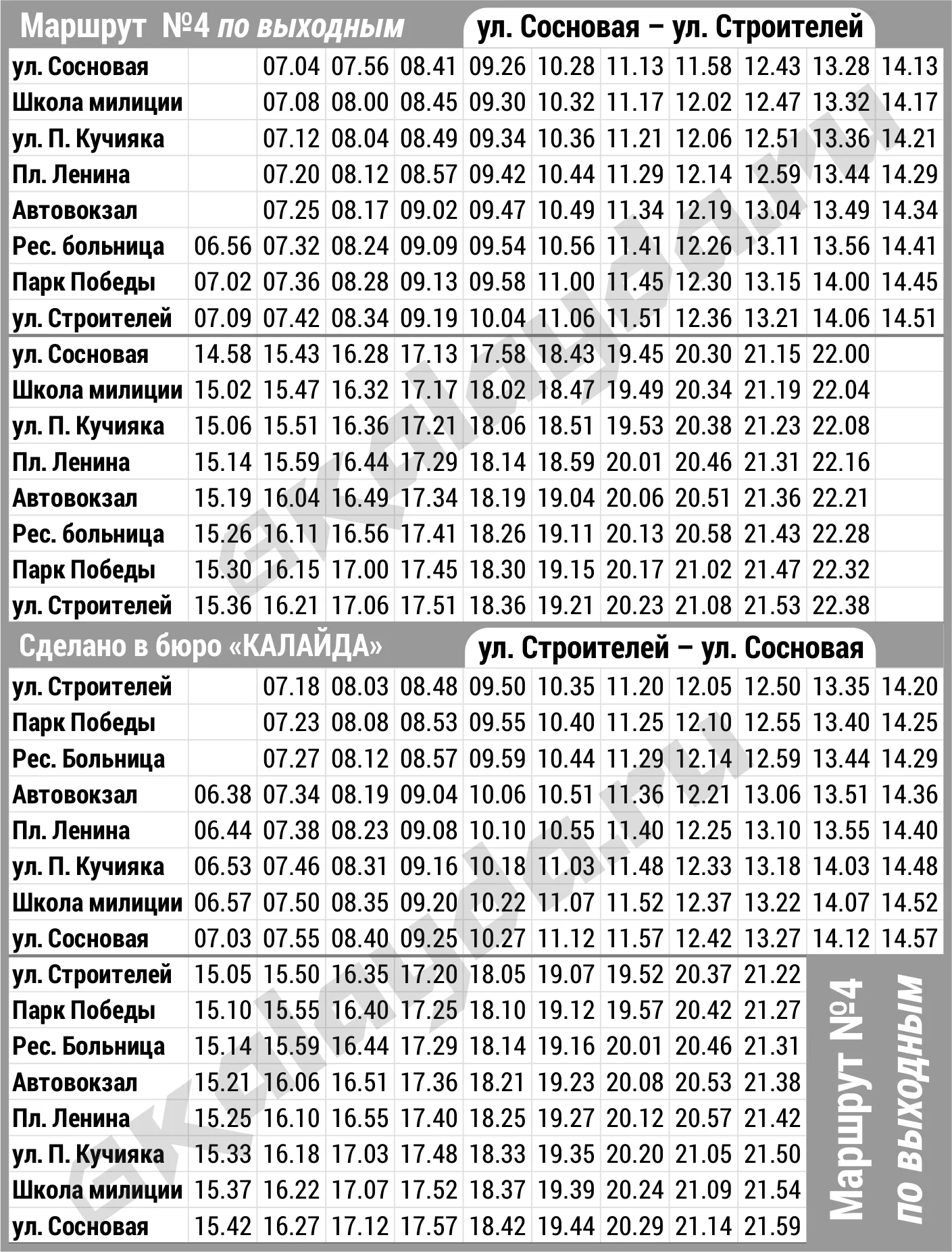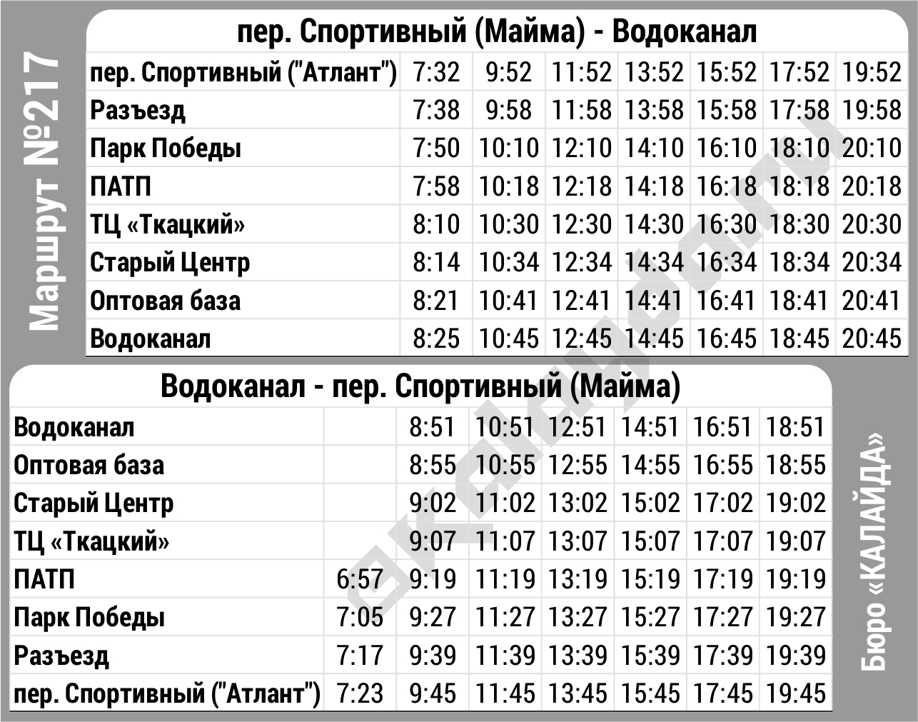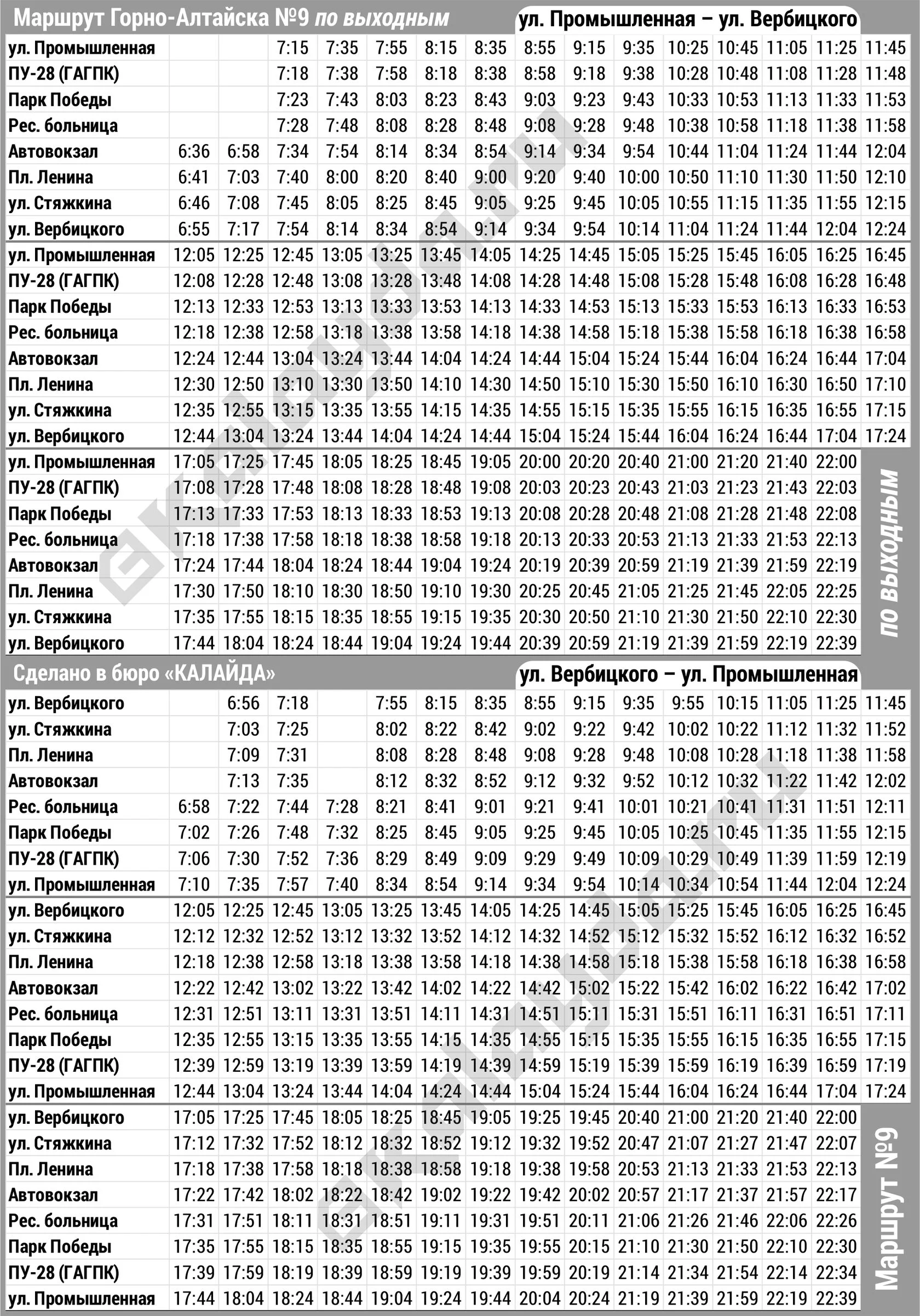 * Расписание автобусных рейсов Горно-Алтайска является актуальным на 11.11.2025 г., однако имеет свойство внезапно меняться. Информацию по междугородним рейсам уточняйте в справочной Горно-Алтайского автовокзала по телефону 8(38822)2 24 57, по городским — в диспетчерской службе перевозчика 8(38822)4 19 04, а по пригородным — в Горно-Алтайском союзе индивидуальных автопредпринимателей 8(38822)4 91 86.